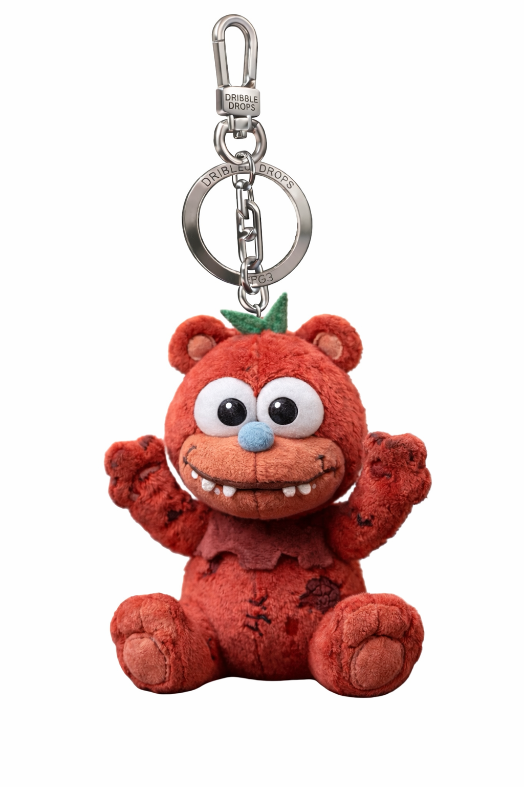 The face is bright and inviting. Oversized embroidered white eyes with deep black pupils give Crimson Sprig an alert, joyful gaze, full of curiosity. A soft powder-blue plush nose adds a whimsical pop of contrast, while a gently curved stitched smile reveals small plush teeth — friendly, imperfect, and full of personality.
