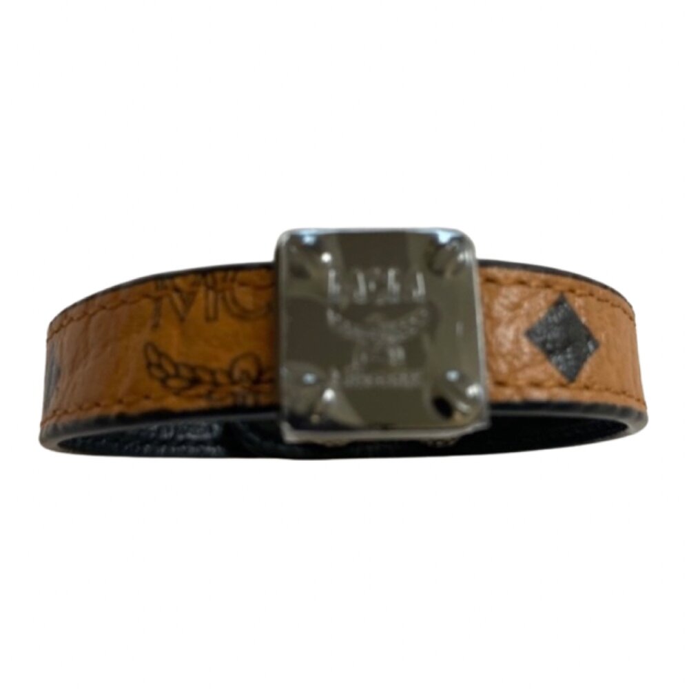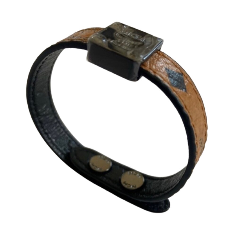 This reversable MCM Leather wrist bracelet features an MCM logo plate in silver-tone cobalt hardware. The monogram Visetos brand reverses to vintage original leather, secured with a double snap closure. This bracelet has a reversible design with a Visetos coated canvas at one side which has a smooth Nappa leather reverse side. Snap closure has dark gold toned hardware. Unisex. Color: Cognac