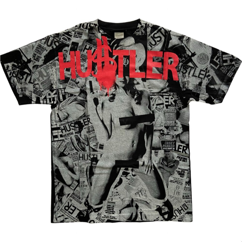 This is an extremely rare and hard to find vintage Hustler Magazine Short Sleeve Shirt. This shirt has been carefully stored for years to keep it in this great condition. The shirt features an image of a Hustler Magazine model surrounded by various Hustler Magazines on the front of the shirt as shown. Size: Medium, Color: Black