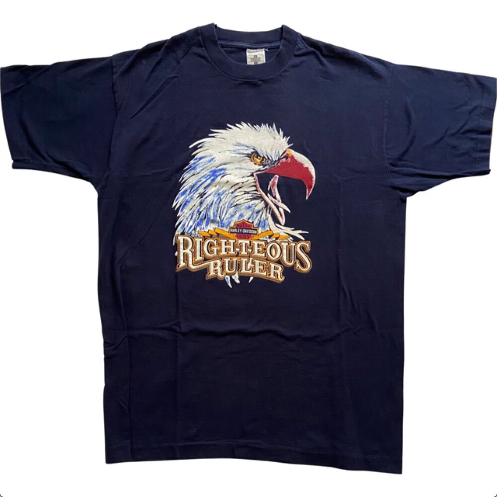 This is an extremely rare and hard to find vintage Harley-Davidson Righteous Ruler Short Sleeve Shirt. This shirt has been carefully stored for years to keep it in this great condition. The shirt features an image of a Harley-Davidson Eagle with the words "Righteous Ruler" underneath it, as shown. Size: X-Large, Color: Navy Blue