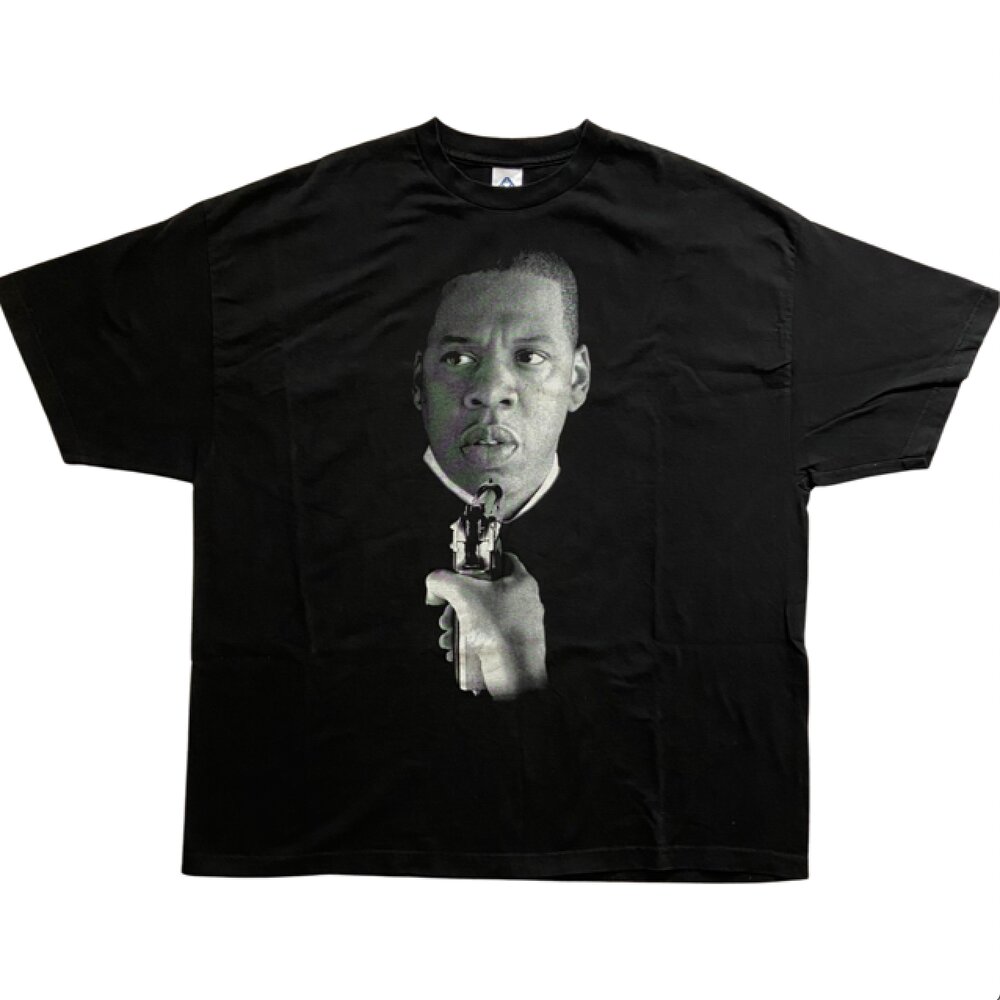 This is an extremely rare and hard to find vintage Jay-Z Short Sleeve Shirt. This shirt has been carefully stored for years to keep it in this great condition. The shirt features an image of rap artist Jay-Z with a gun being pointed at him on the front of the shirt as shown. Size: 3XL, Color: Black