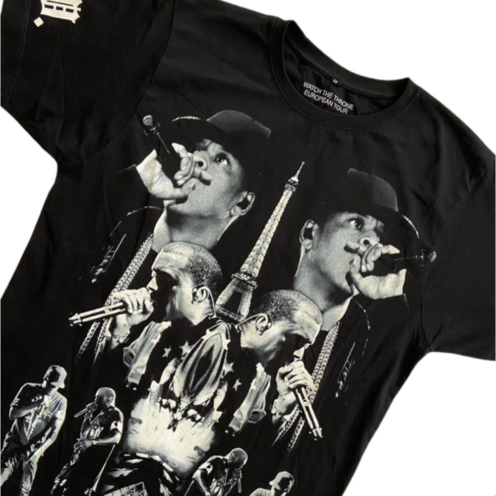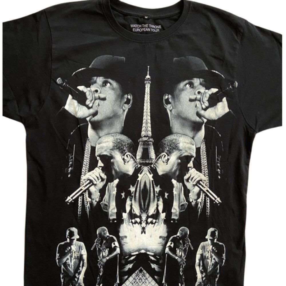 This is an extremely rare and hard to find vintage Kanye West Jay Z Watch the Throne European Tour Short Sleeve Shirt. This shirt features an illusion image of Kanye West and Jay Z on the front of the shirt with the letters "WTT" on the back of the shirt. The sleeves have the initials of Kanye West and Jay J on each side of the sleeve. This shirt was purchased in Europe during the Watch The Throne European Tour. Size: Medium, Color, Black