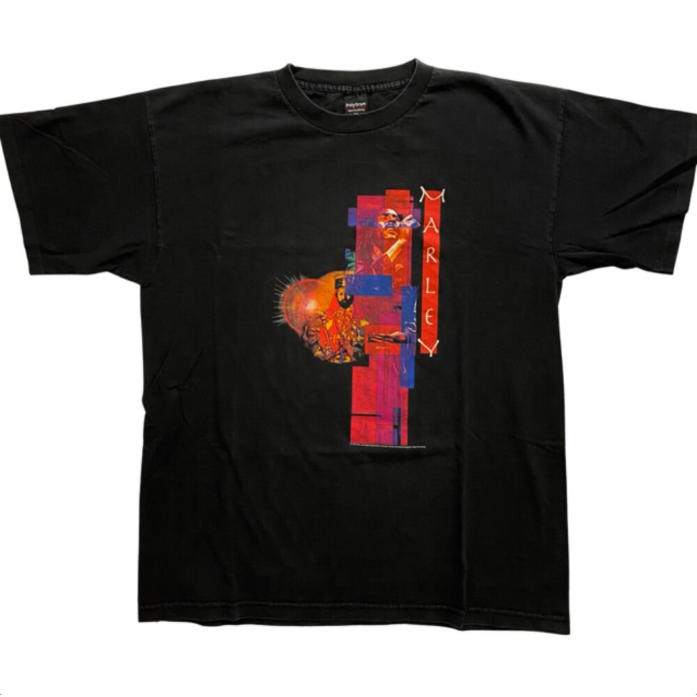 This is an extremely rare and hard to find vintage Bob Marley King Short Sleeve Shirt. This shirt has been carefully stored for years to keep it in this great condition. The shirt features an image of reggae artist and songwriter Bob Marley on the front of the shirt with Rasta theme as shown. Size: X-Large, Color: Black