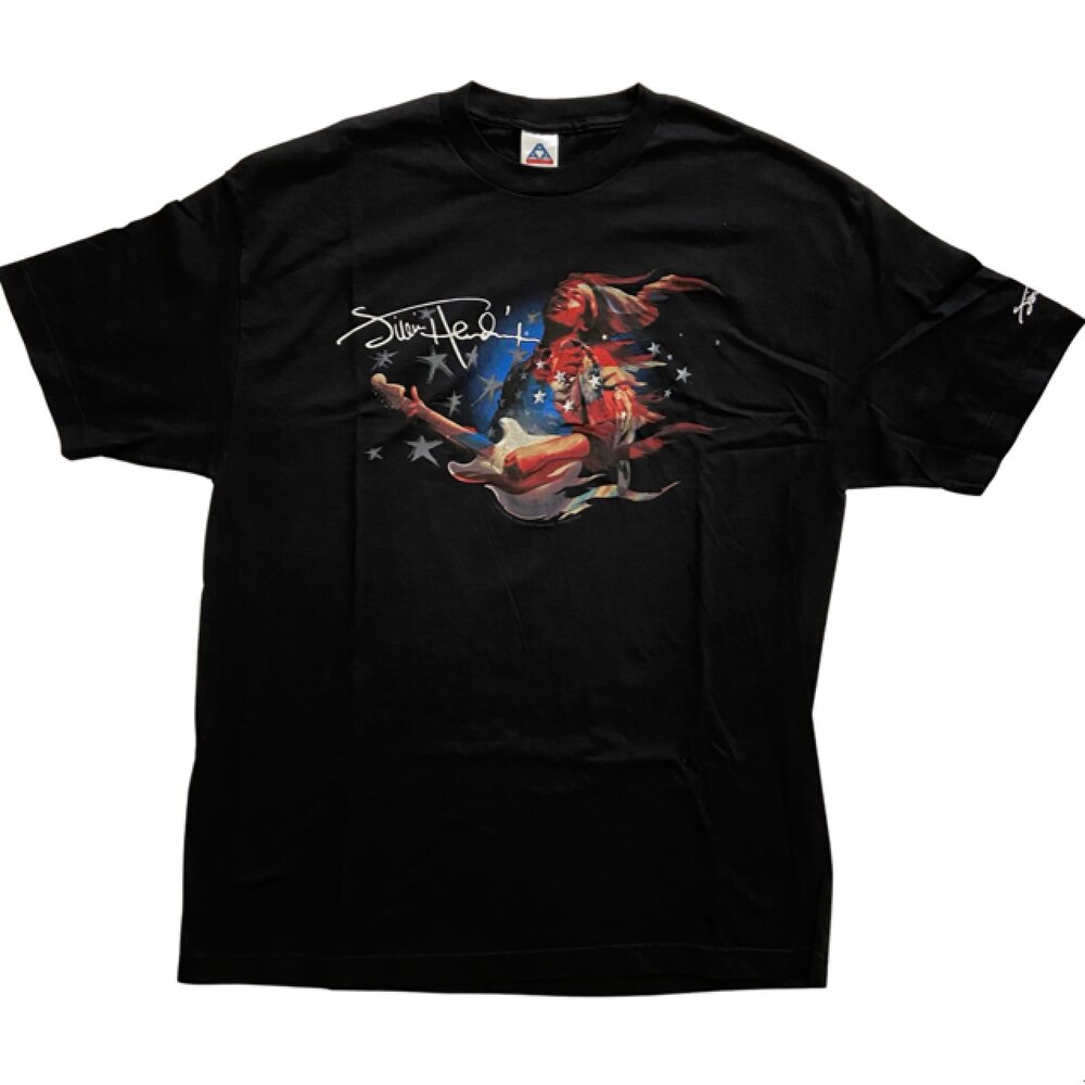 This is an extremely rare and hard to find vintage Jimi Hendrix Stars Spangled Banner Short Sleeve Shirt. This shirt has been carefully stored for years to keep it in this great condition. The shirt features an image of rock & roll artist Jimi Hendrix with the red, white, blue themed stars banner in the background. Size: X-Large, Color: Black